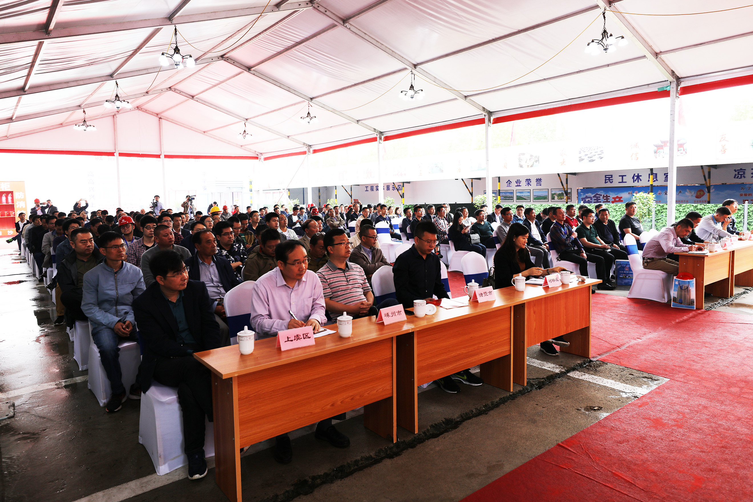 尽管下雨,观摩人员都悉数到场,在精心搭置的棚厅里参与本次会议。海滨集团副总经理陈福祥首先讲话。他简要介绍了浙江海滨市政工程有限公司承建的袍江新区群贤路改造工程III标概况及进度,从该工程项目部全面落实安全生产、文明施工谈了七个具体措施,分别为:落实安全文明施工措施费的资金使用;项目安全生产保证体系;强化安全教育培训;强化安全技术工作,为安全生产提供保证;强化施工现场的文明施工管理;安全防护设置;加强扬尘治理。他特别从安全和文明施工方面介绍了项目部落地执行的措施及管理方法,并提出借由此次市政项目的建设和被政府列为观摩点为良好契机,来鞭策强化自身管理水平,弥补不足之处,不断优化追求标准,以回报领导厚爱和社会支持。