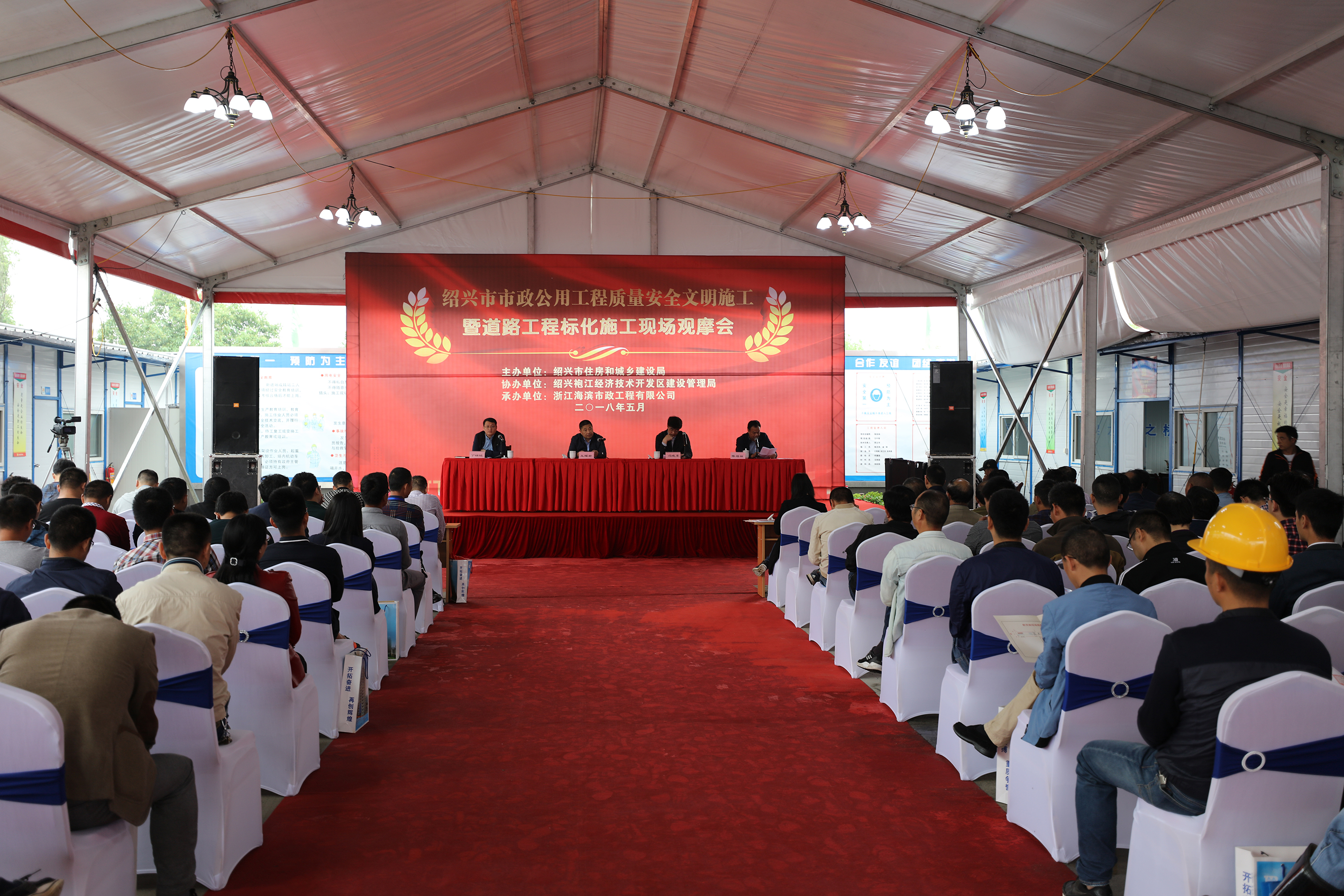 5月8日上午,绍兴袍江新区群贤路(中兴大道——越兴路)改造工程III标召开绍兴市市政公用工程质量安全文明施工暨道路工程标化施工现场观摩会。全市各地建筑行业领导、负责人共200余人出席会议,会议由绍兴市住建局建筑业处副处长丁锦铭主持,绍兴市住建局建筑业处处长王耀君、绍兴市袍江经济技术开发区建筑工程质量安全监督站站长冯晓东、浙江海滨建设集团有限公司副总经理陈福祥参加会议并讲话。